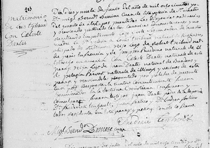 Louis Thibaud & Celeste Dartes Marriage (v. 4 #203; St. Martin de Tours Catholic Church; St. Martinville; St. Martin Parish, LA)
